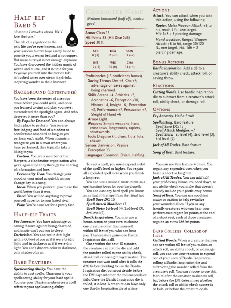 You can use a musical instrument as a spellcasting focus for your bard spells. Spell save dc p a. Miscellaniuos or magical modifier i vl bard level hp hit points spell slots and castings 1st 2 oooooooooooooooooo oo o o cantrips known spells known.